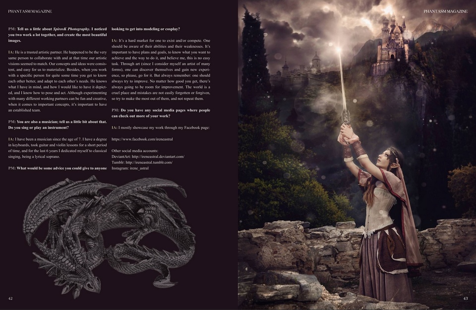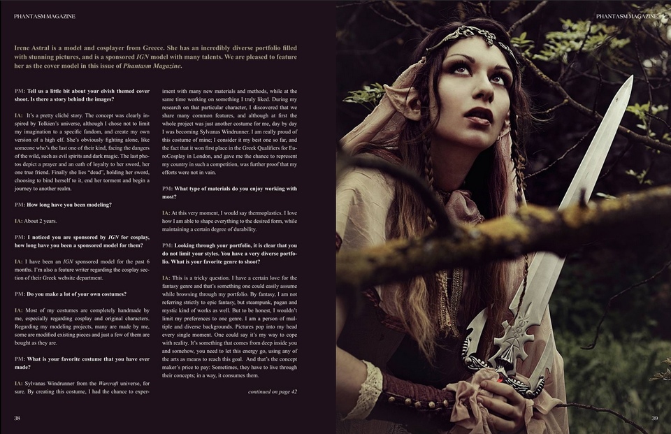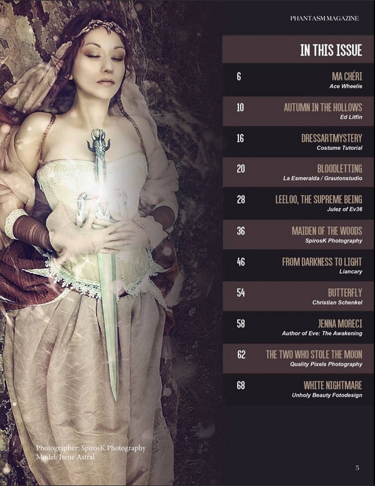 Cover and feature in "Phantasm Magazine of the joint project "Maiden of the woods", with Irene Astral and Jennifer Ray (Issue #5, Sep.2015) ( Photos here ) [also in print]